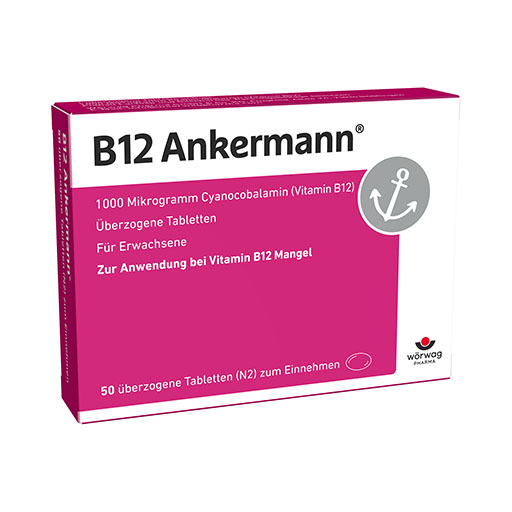 B12 Ankermann®. Wirkstoff: Cyanocobalamin 1000 Mikrogramm. Anwendungsgebiete: Behandlung von Vitamin-B12-Mangelzuständen, die durch Mangelernährung verursacht werden, Behandl. (Erhaltungstherapie) von Vit.-B12-Mangelzuständen, z. B. in Folge einer beeinträchtigten Aufnahme (Resorption) von Vit. B12, dauerhafte Behandl. einer durch Vit.-B12-Mangel induzierten perniziösen Anämie nach Normalisierung der Blutwerte. Die Behandl. einer perniziösen Anämie bzw. neurolog. Symptome erfolgt zu Beginn parenteral bis zur Normalisierung der Blutwerte. B12 Ankermann® wird angew. bei Erwachsenen. Zu Risiken und Nebenwirkungen lesen Sie die Packungsbeilage und fragen Sie Ihre Ärztin, Ihren Arzt oder in Ihrer Apotheke. Wörwag Pharma GmbH & Co. KG, 71034 Böblingen