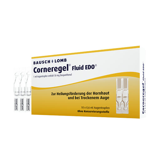 Anwendungsgebiete: Corneregel® Fluid EDO® ist ein Mittel zur Heilungsförderung der Hornhaut und eine synthetische Tränenflüssig- keit. Zur symptomatischen Behandlung von Austrocknungserscheinungen der Horn- und Bindehaut; zur unterstützenden Behandlung der Heilung von Haut- und Schleimhautläsionen des Auges.