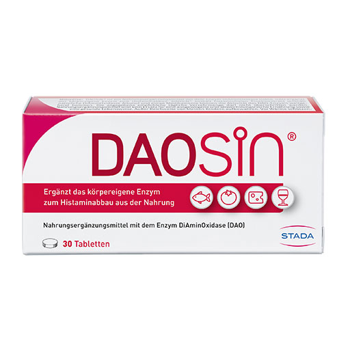 DAOSiN® ergänzt den Körper beim Abbau von Histamin aus der Nahrung. Durch die Einnahme von DAOSiN® Tabletten vor der Mahlzeit kann die DAO-Menge erhöht werden und im Verdauungstrakt ein ausreichender Abbau von Histamin aus der Nahrung erzielt werden.