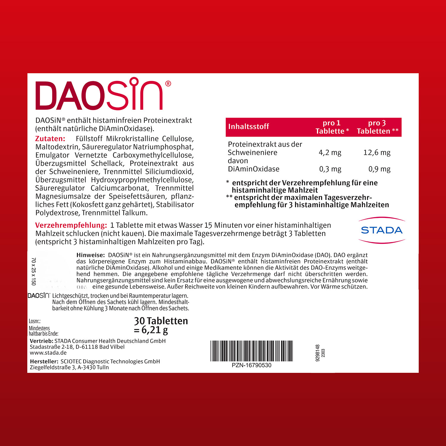Verzehrempfehlung: Nehmen sie 15 Minuten vor einer histaminhaltigen Mahlzeit 1 Tablette ein.