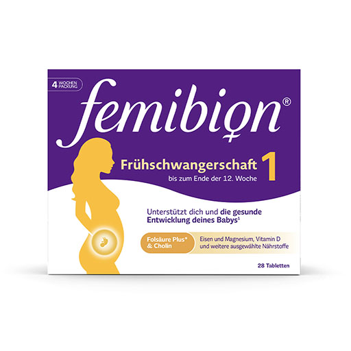 Auch in der frühen Schwangerschaft spielt Folat eine zentrale Rolle: Es ist wichtig für die Entwicklung des Babys, da es die Zellteilung, die Blutbildung und das Wachstum des mütterlichen Gewebes, einschließlich der Plazenta, unterstützt. Femibion® 1 Frühschwangerschaft enthält als erstes Produkt zusätzlich auch Cholin. Ihr Baby kann es nicht selbst bilden und ist deshalb von der Versorgung durch die Mutter abhängig.* Ihr Bedarf erhöht sich während der Schwangerschaft.**