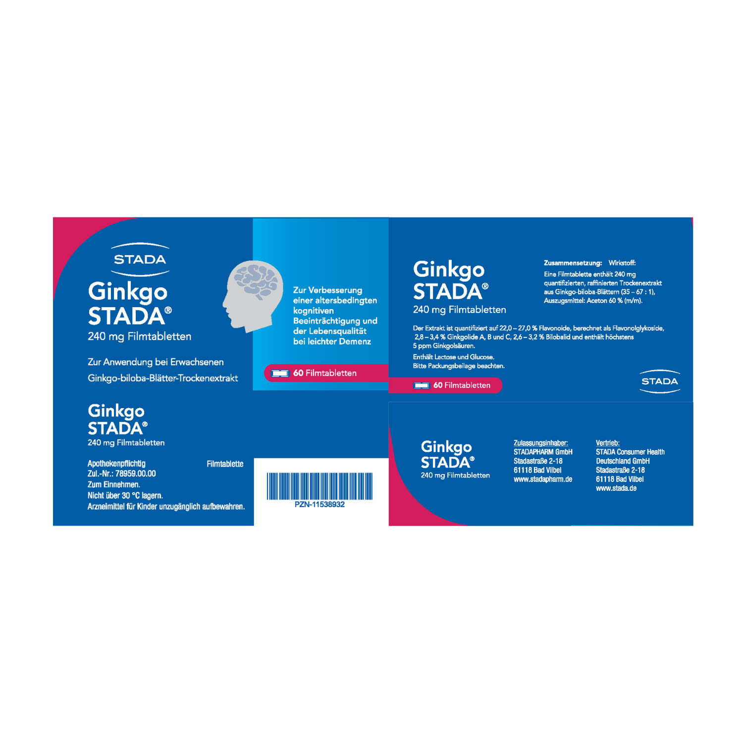 Anwendungsgebiete: Ginkgo STADA® ist ein pflanzliches Arzneimittel zur Verbesserung einer altersbedingten kognitiven Beeinträchtigung und der Lebensqualität bei leichter Demenz. Enthält Lactose und Glucose.
