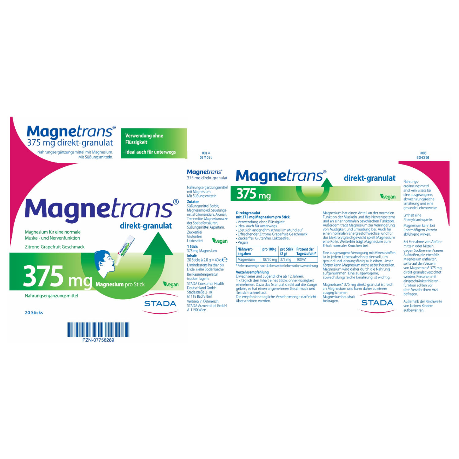 Mit Magnetrans® 375 mg direkt-granulat decken Sie 100% des täglichen Magnesiumbedarfs*in einer Portion. Die Magnesium Sticks sind dabei besonders praktisch für unterwegs. Für die Einnahme brauchen Sie keine Flüssigkeit: Magnetrans® direkt-granulat 375 mg löst sich angenehm leicht im Mund auf und schmeckt frisch nach Zitrone-Grapefruit. Magnetrans® 375 mg direkt-granulat ist vegan, laktose- und glutenfrei. Es enthält das Süßungsmittel Aspartam.