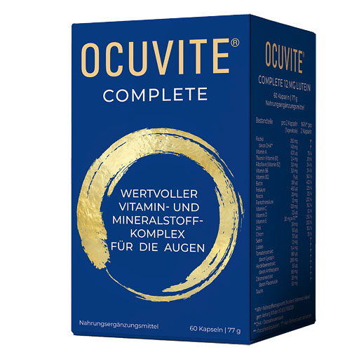 Unsere Augen müssen stetig mit Vitalstoffen versorgt werden, die sie stärken und schützen.2 Das Nahrungsergänzungsmittel Ocuvite® Complete 12 mg Lutein enthält die Vitamine A und B2 (Riboflavin) zum Erhalt der Seh- kraft sowie wertvolles Lutein, Omega-3-Fettsäuren und das wichtige Spurenelement Zink, dass dazu bei- trägt die Zellen vor oxidativem Stress zu schützen.