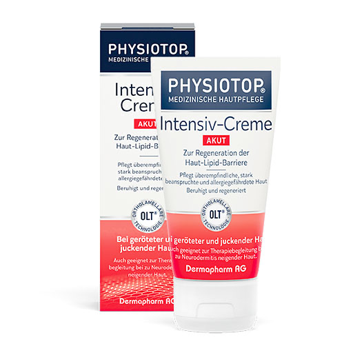 Physiotop® Akut Intensiv-Creme mit ihrer auf die Bedürfnisse juckender, geröteter und stark beanspruchter Haut abgestimmten Rezeptur regeneriert durch die innovative OLT®-Technologie die natürliche Haut-Lipid-Barriere und versorgt die Haut sowohl mit Feuchtigkeit (u. a. durch Glycerin und den essentiellen Aminosäuren Glycin und Serin) als auch mit juckreizlindernden und beruhigenden Inhaltsstoffen wie Weihrauch oder Avenanthramide, den aktiven, natürlichen Bestandteilen von Hafer. Physiotop® Akut Intensiv-Creme eignet sich daher ideal für die Akut-Pflege sowie zur therapiebegleitenden Pflege bei Neurodermitis – insbesondere für kleinere Hautpartien wie Gesicht, Armbeugen oder Kniekehlen.