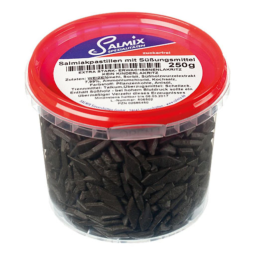 Zutaten: Weizenmehl, Sorbit, Süßholzextrakt, Ammoniumchlorid, Kochsalz, Farbstoff E153, Anisöl, Trennmittel: Talkum, Überzugsmittel: Schellack.